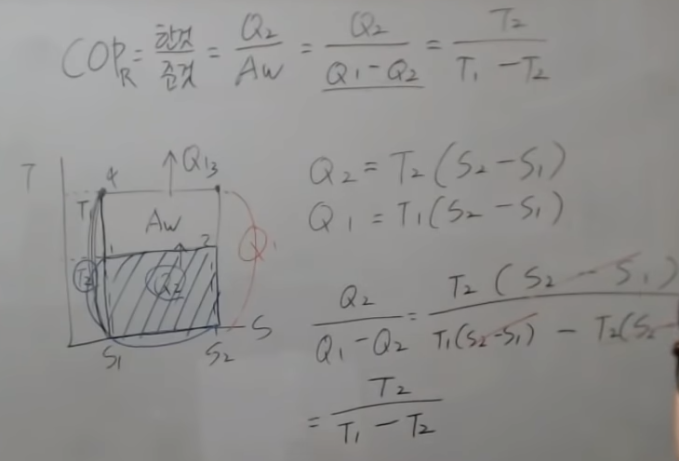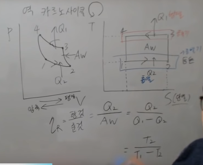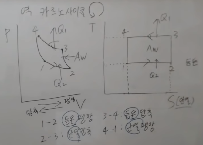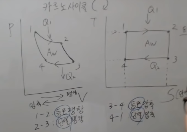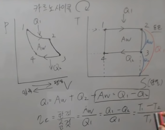 - 카르노 사이클 : 두개의 단열과정과 두개의 등온과정으로 이루어져 있다.