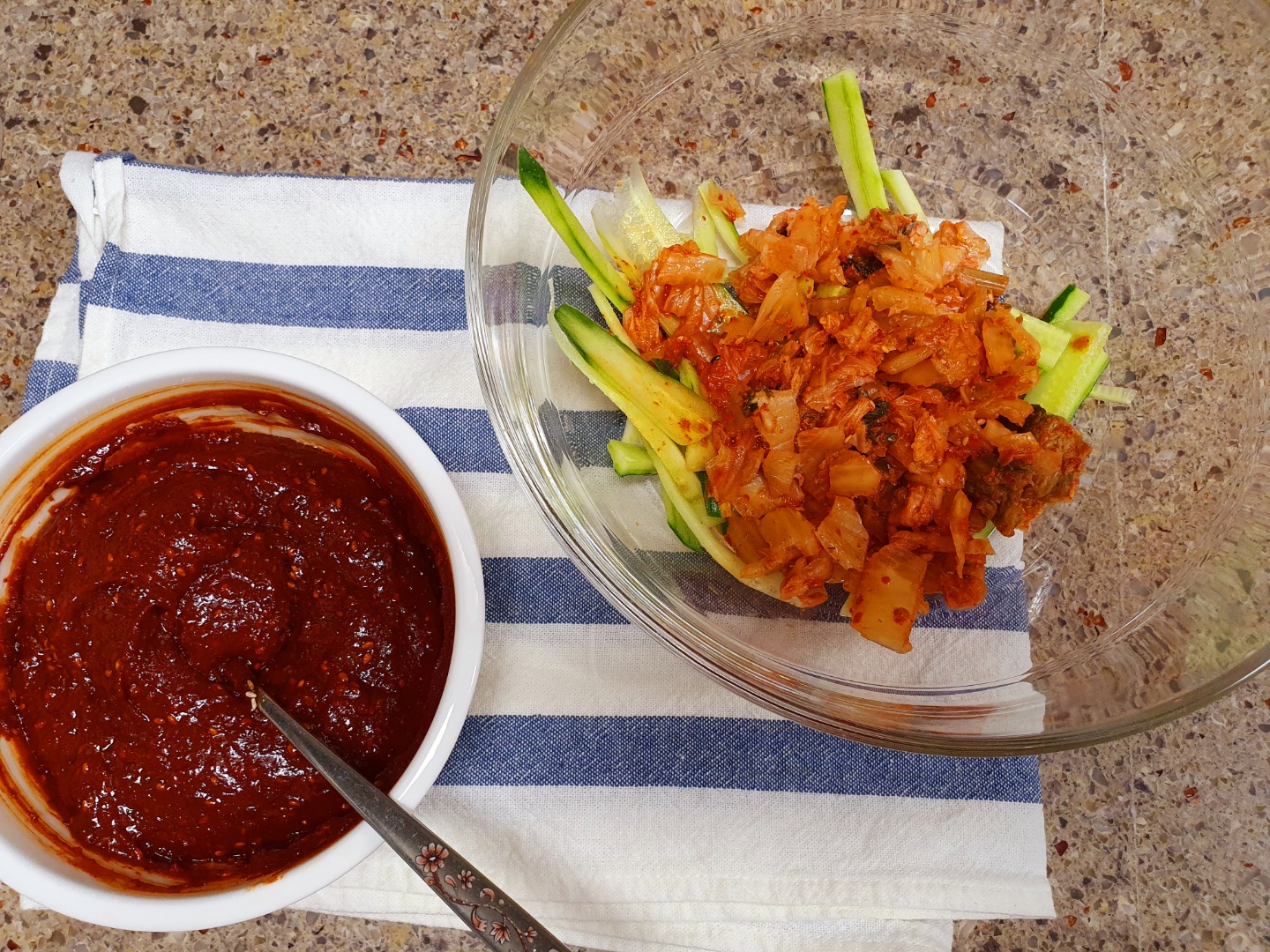 냉장고에 있던 오이와 김치 준비해서 국수랑 맛있게 비벼줌